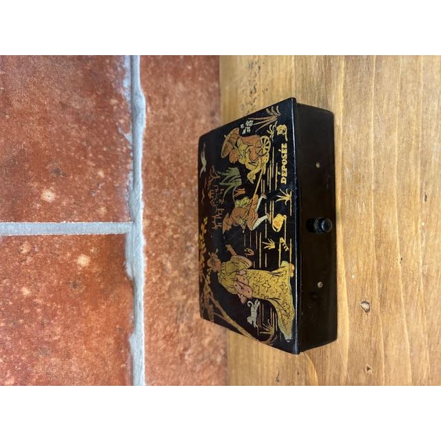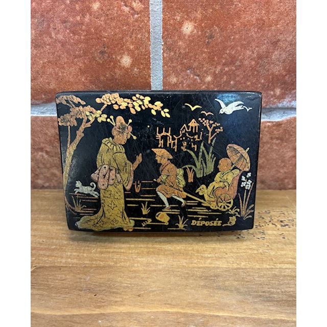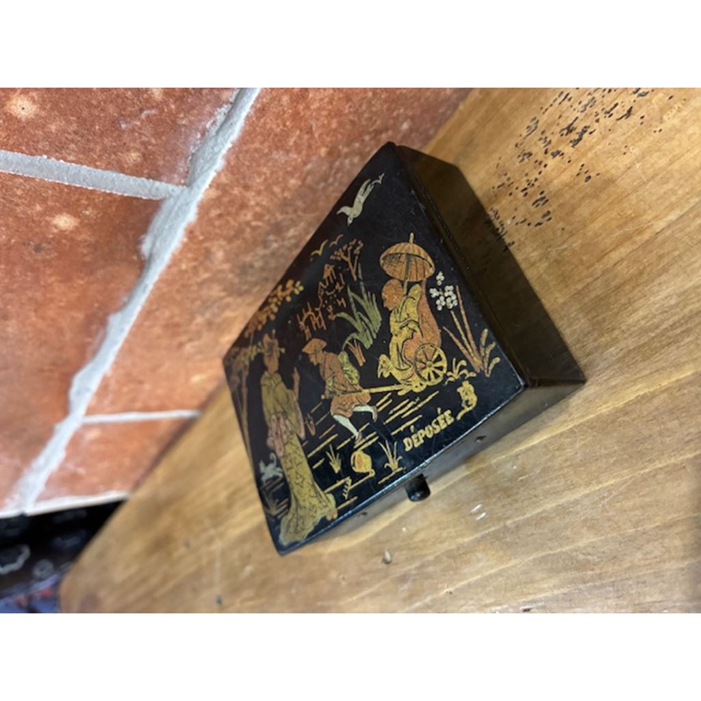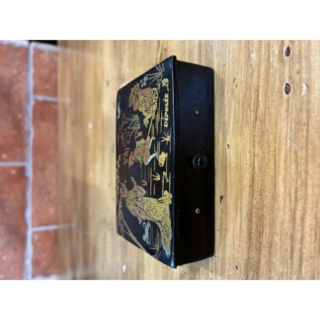 Made in France from ebonised papier-mâché —a highly valued technique during the 19th and early 20th centuries— it features an elegant oriental-inspired scene in golden tones on a black background, with figures, landscapes and motifs characteristic of the Chinoiserie style.