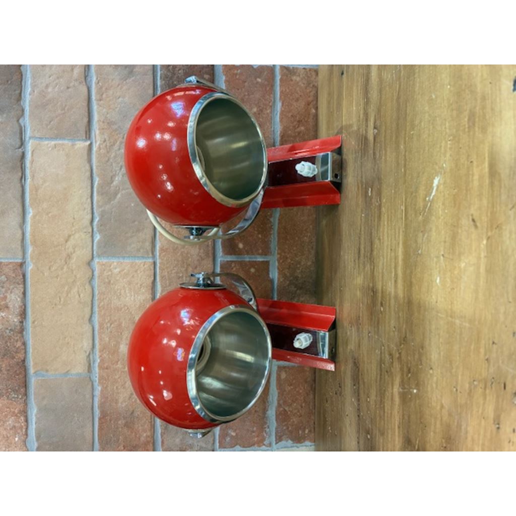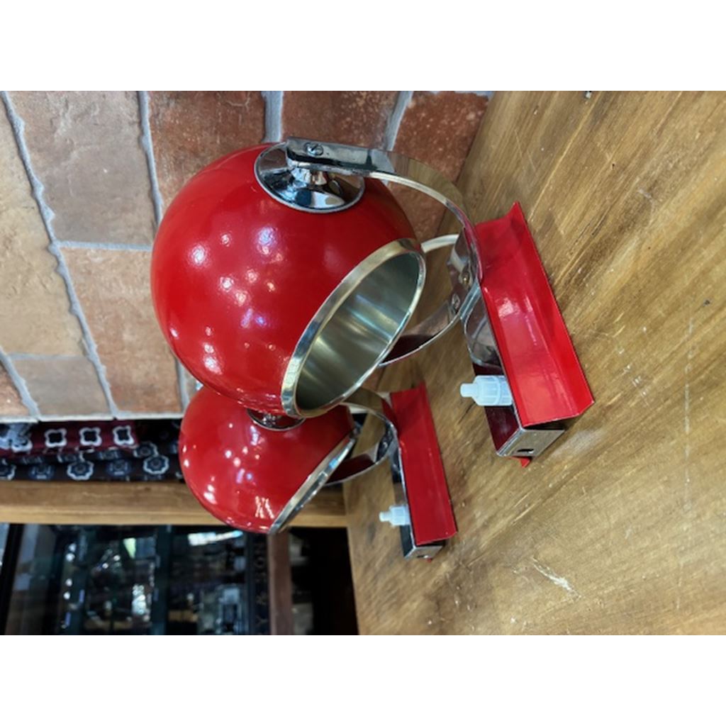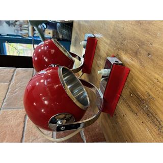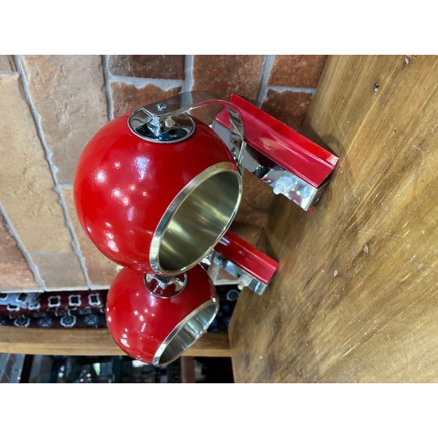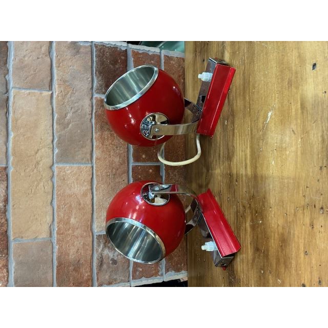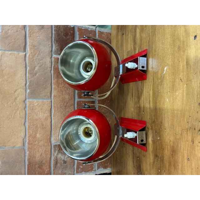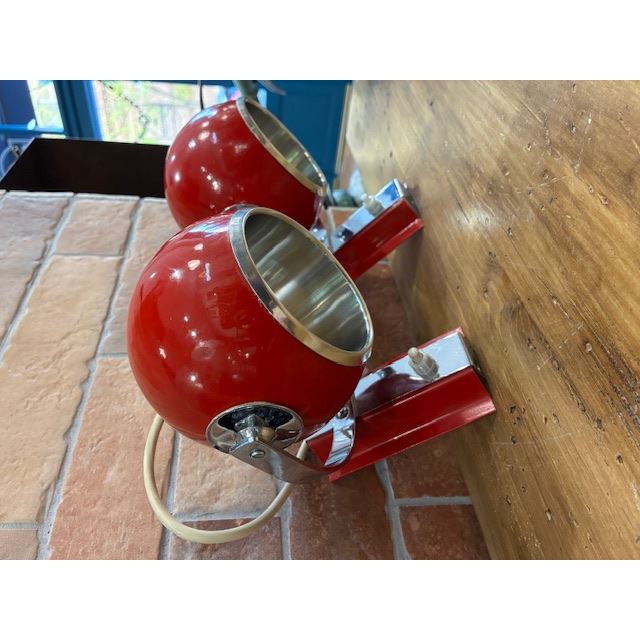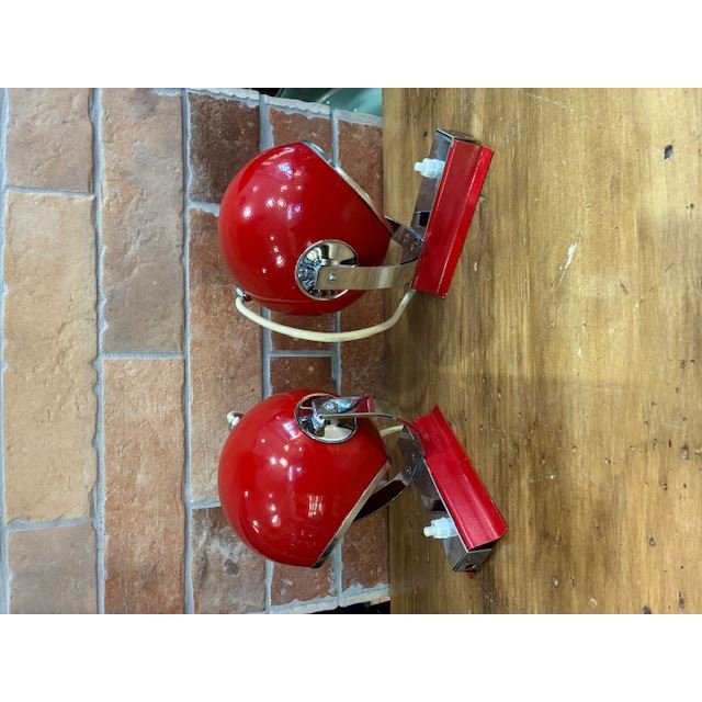 Antique pair of Fase Eyeball wall lights, one of the most iconic pieces of Space Age design from the 1960s and 1970s. Their characteristic spherical shape, finished in bright red with chrome details, reflects the futuristic and functional aesthetic that defines the Spanish brand Fase. Thanks to their fully adjustable design, they allow the light to be directed with great versatility, making them ideal for accent or functional lighting. Perfect for any space, offering a distinctive vintage, retro or mid-century style.