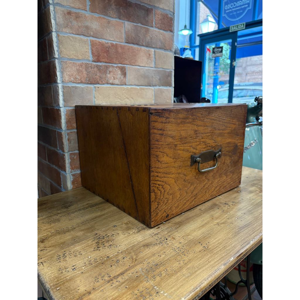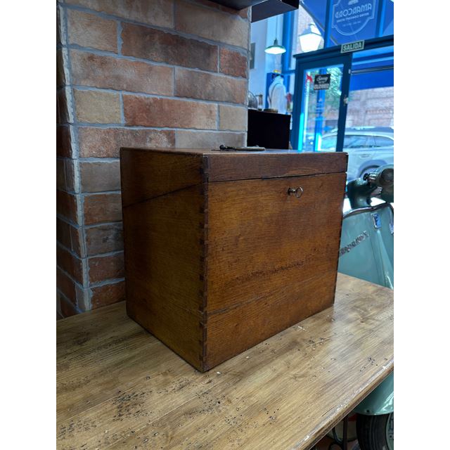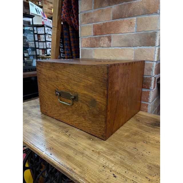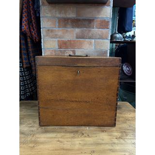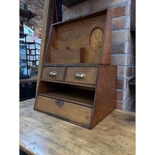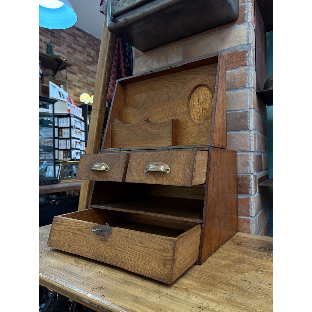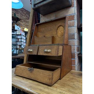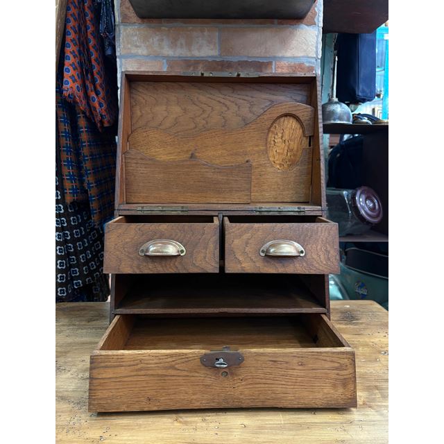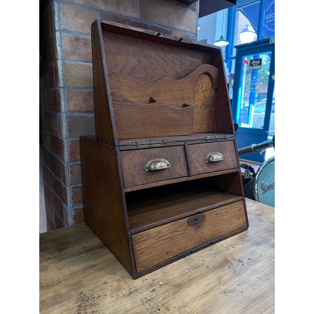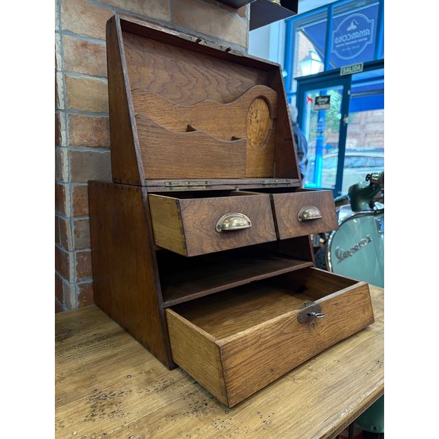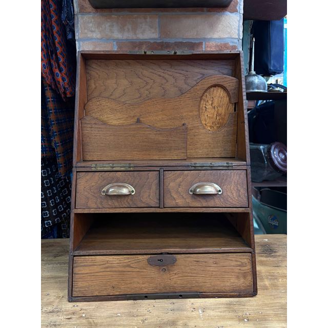 This robust stationery cabinet is an excellent example of technical office furniture from the turn of the century. Unlike luxury travel desks, this piece is crafted from quarter-sawn oak, featuring the characteristic "tiger-stripe" grain known for its durability and beauty. The structure has a sloped front with a drop-down lid designed to keep the contents dust-free. The interior boasts an elegant scalloped letter rack for organizing envelopes and a circular niche originally intended for accessories like a roller calendar or an inkwell. The central body integrates two drawers with brass cup (or shell) handles, while the base features a deep drawer with a security lock and a functional key. A piece designed for efficient document management in professional offices, law firms, or post offices of the era.