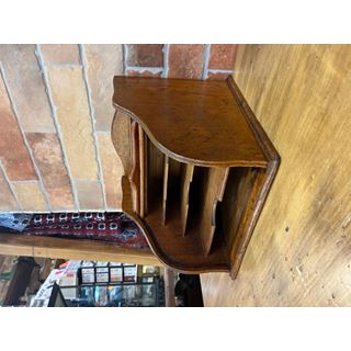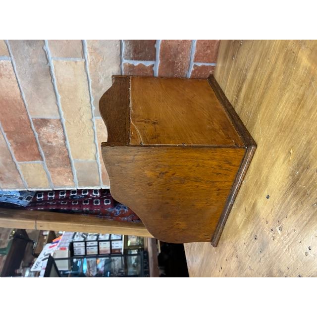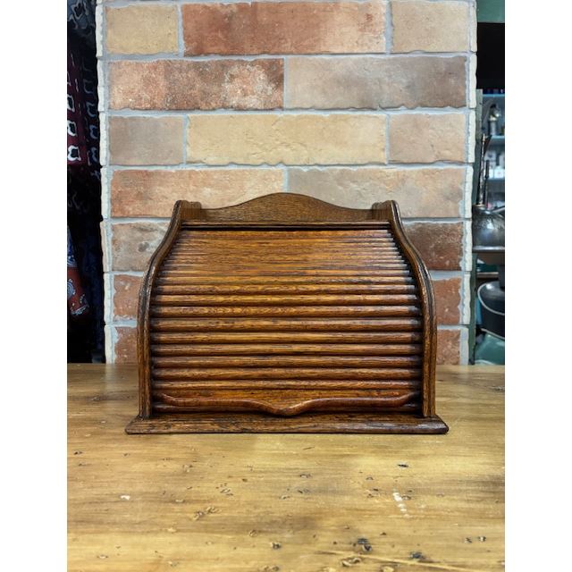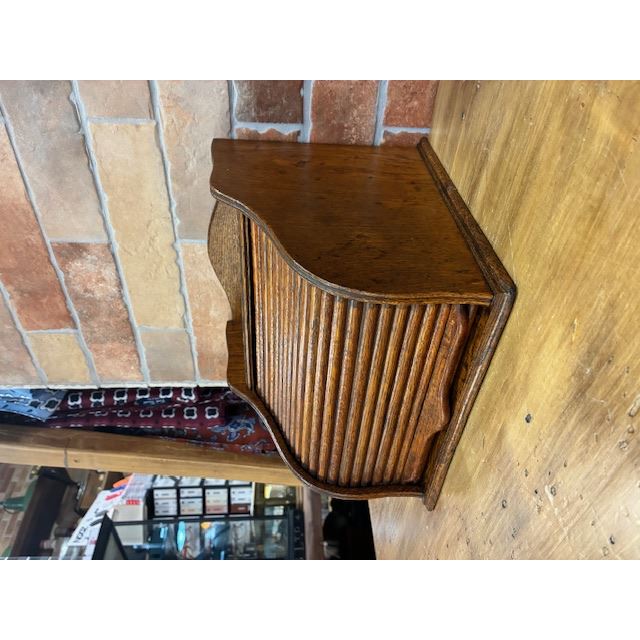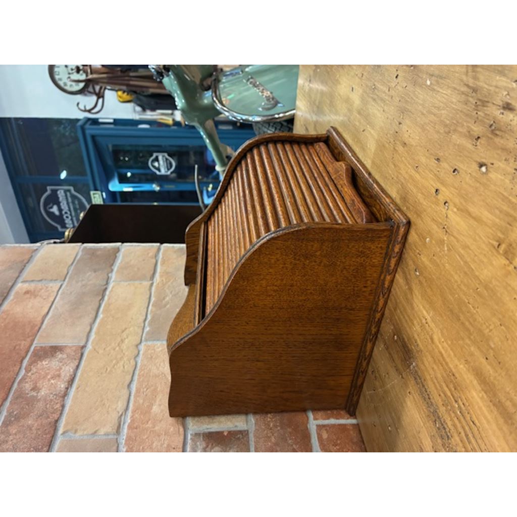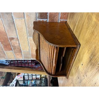 Antique wooden filing cabinet in a smaller size, perfect for placing in any corner. Its design is compact and features a roller shutter-style opening system.