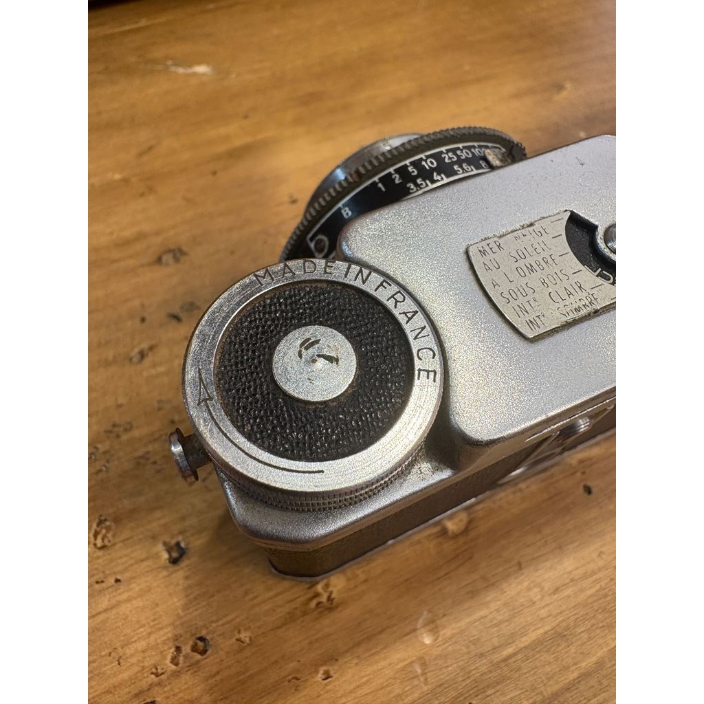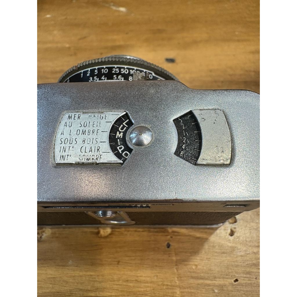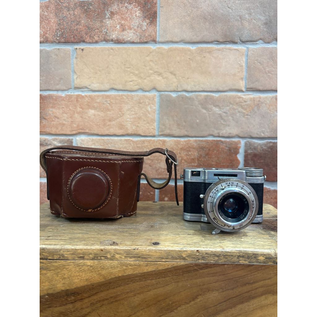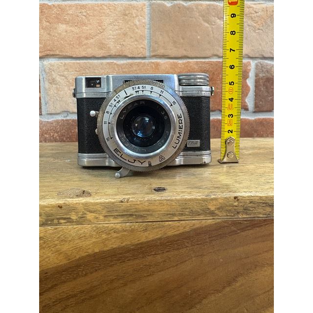 The Lumière Eljy Club (1951) is an iconic French subminiature camera made of chromed aluminum. It features a collapsible Lypar f/3.5 40mm lens, allowing it to be reduced to a minimal size for easy transport, while offering the exceptional mechanical build typical of the Lumière brand. This piece is famous for its ingenious weather-based exposure calculator on the top plate. Its unique design produces 24x36mm negatives using unperforated 35mm film, achieving a much more compact size than the Leica cameras of its time.