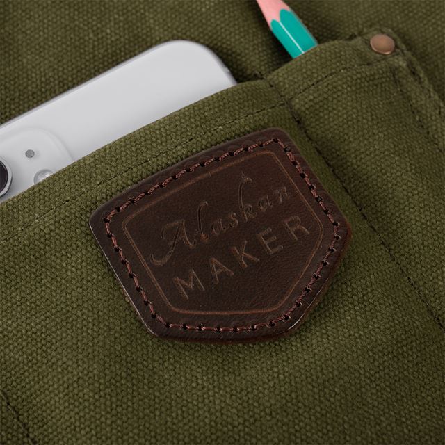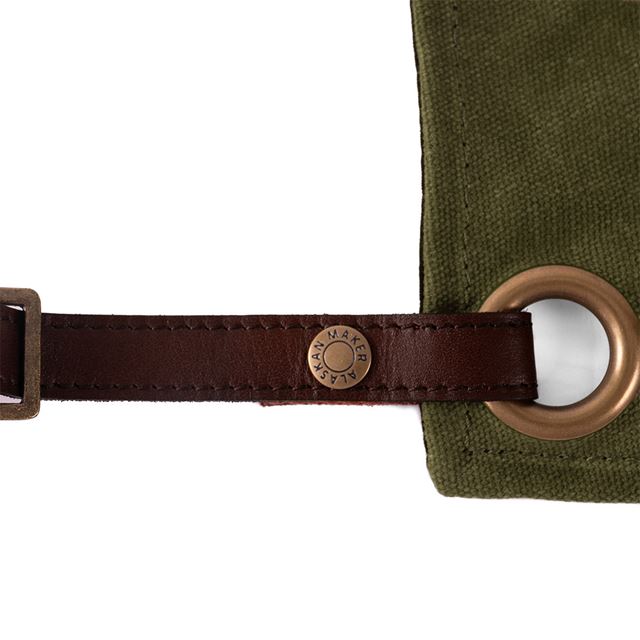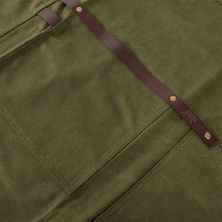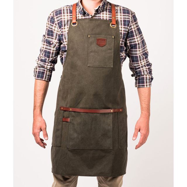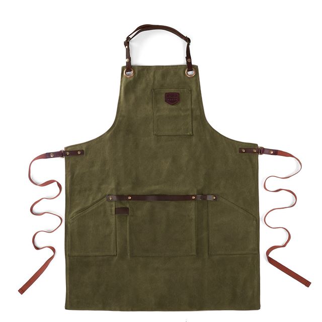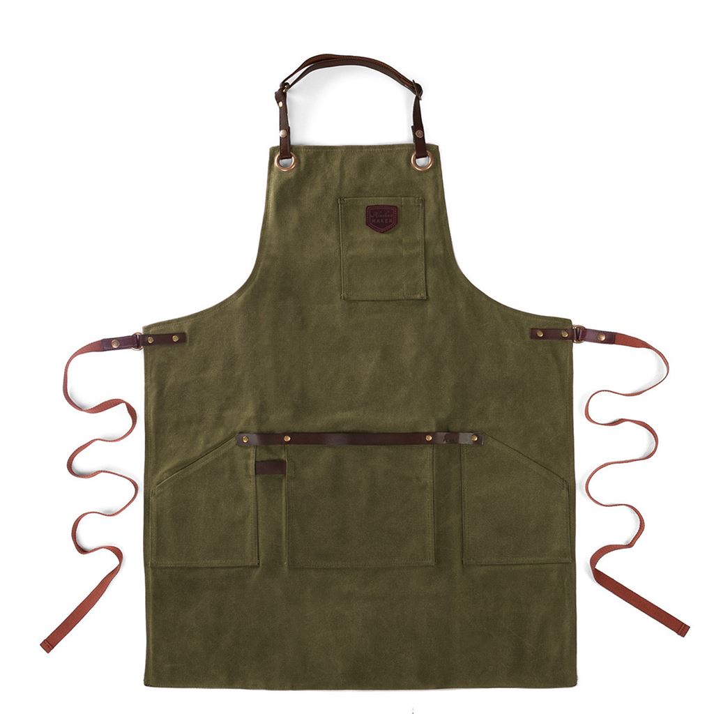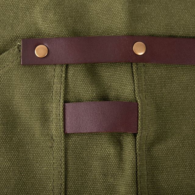 La base del delantal está confeccionada en lona 100 % algodón gruesa y encerada, capaz de repeler el agua y resistir manchas, salpicaduras y el ritmo de cualquier cocina o barbacoa. Es sólido, práctico y sin artificios: líneas limpias, acabados en cuero y un diseño moderno que prescinde de volantes, estampados y mensajes. Sobrio, elegante e irresistible.