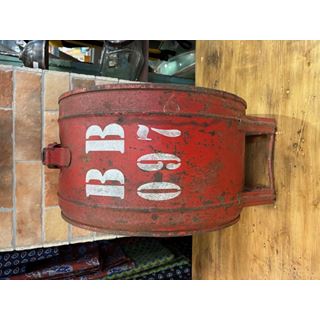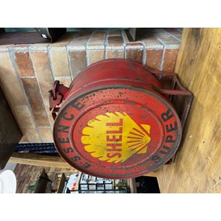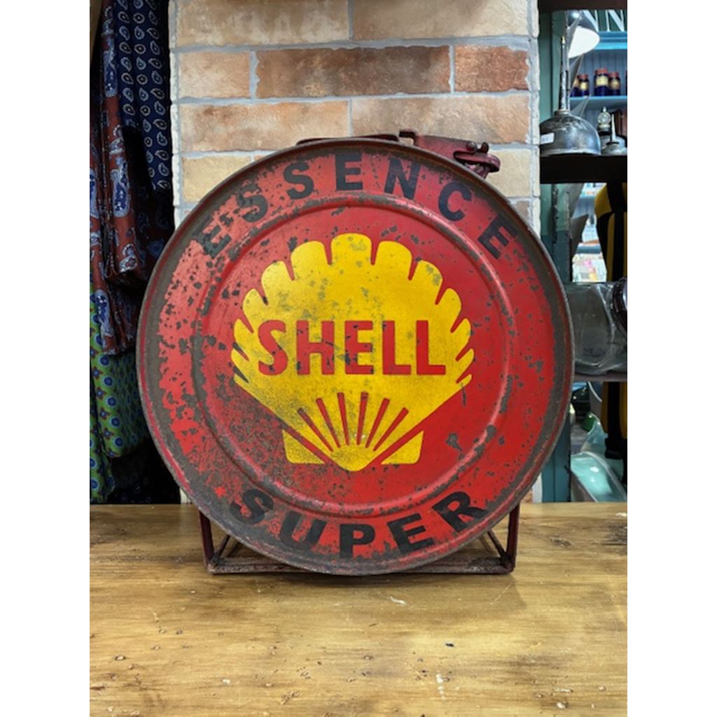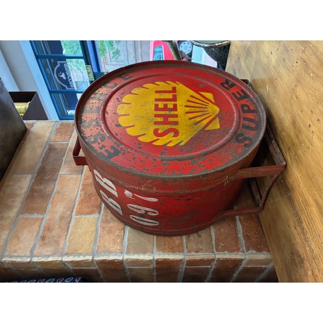 Antiguo bidón metálico Shell "Essence Super", destinado históricamente al almacenamiento y transporte de combustible. Pieza de época, asociada a estaciones de servicio y distribución de carburantes Shell durante la segunda mitad del siglo XX.