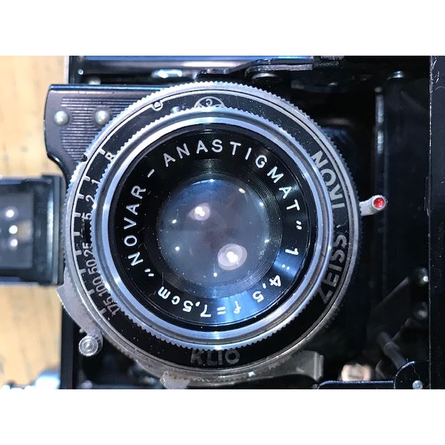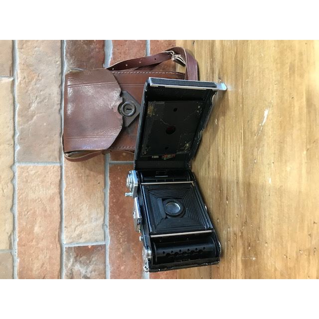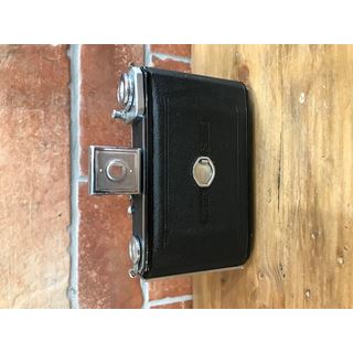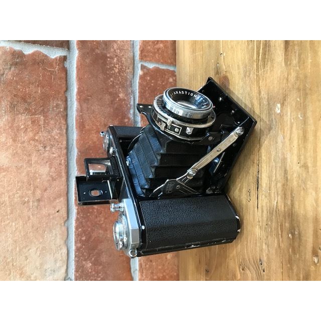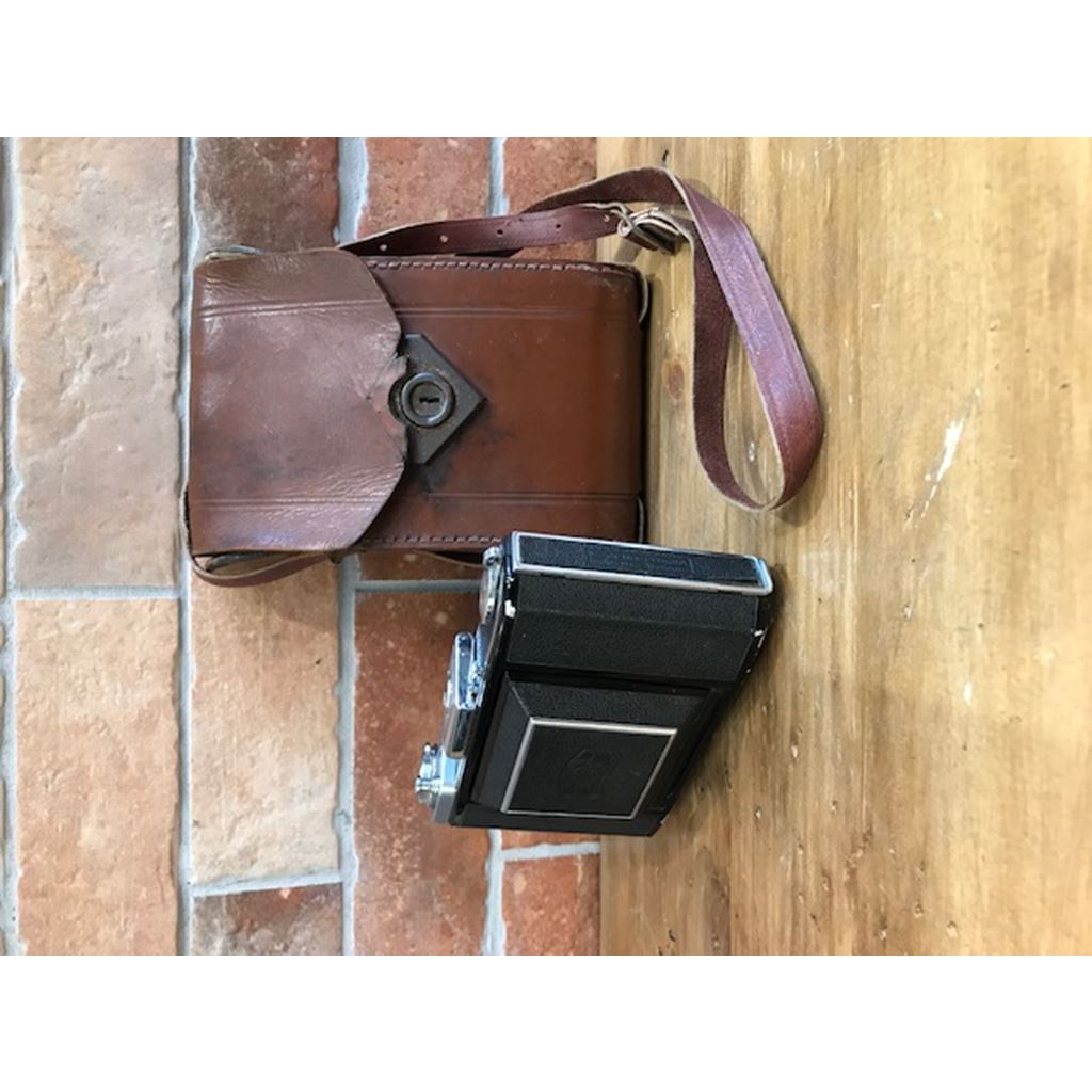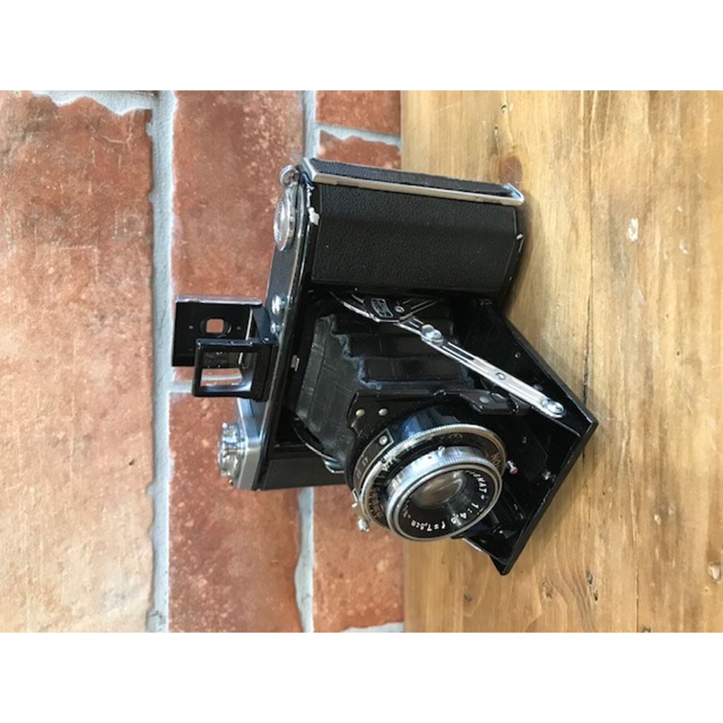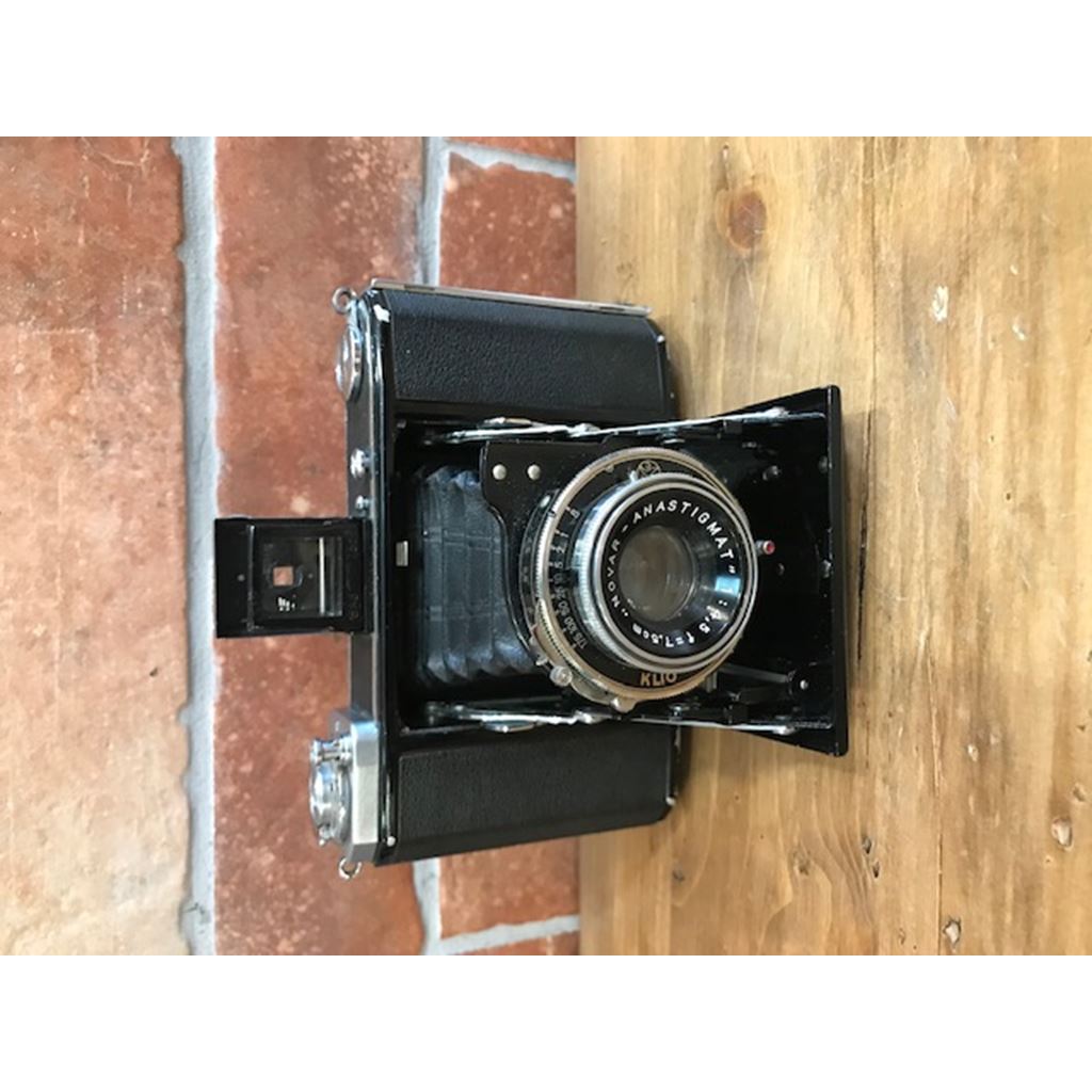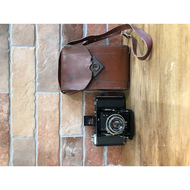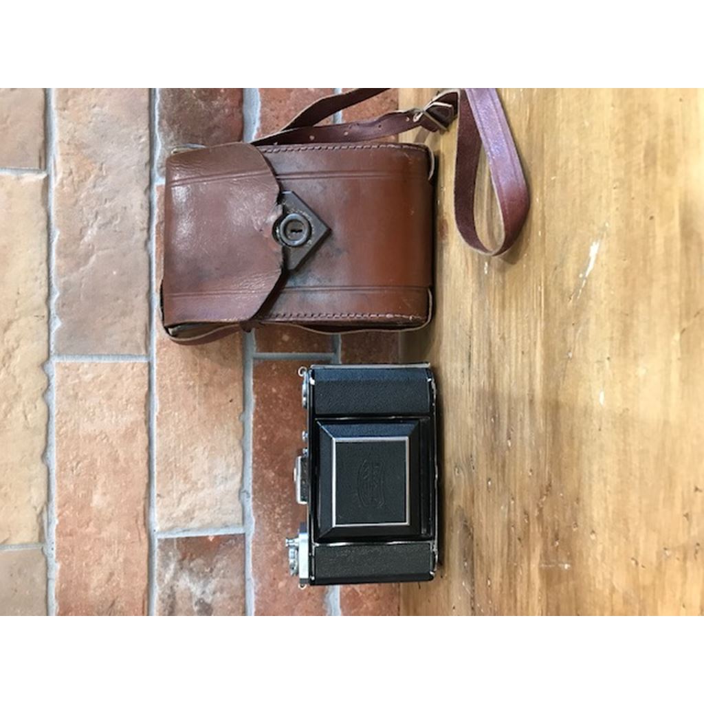 Ancien appareil photo Zeiss Ikon Ikonta 521/16, fabriqué après la Seconde Guerre mondiale, entre 1948 et 1954. Ce modèle emblématique reflète la qualité allemande et un design élégant et fonctionnel. Il est doté d'un objectif à soufflet rétractable, équipé d'un anastigmat Novar 4,5/75 mm, connu pour ses images nettes et précises. L'appareil est livré avec un solide étui en cuir marron, qui protège sa structure et rehausse son caractère vintage. Il s'agit d'une pièce idéale pour les collectionneurs, les amateurs de photographie classique ou ceux qui apprécient l'esthétique et l'histoire de la photographie analogique.