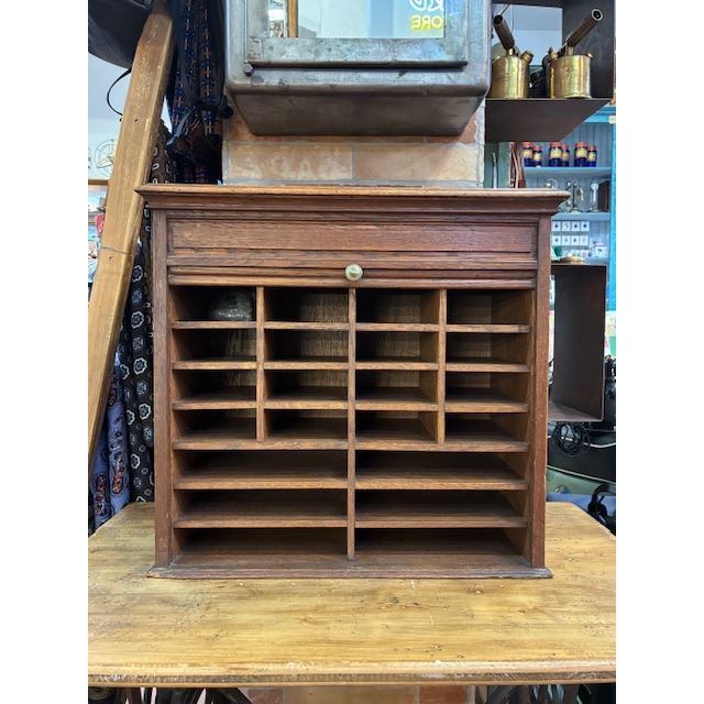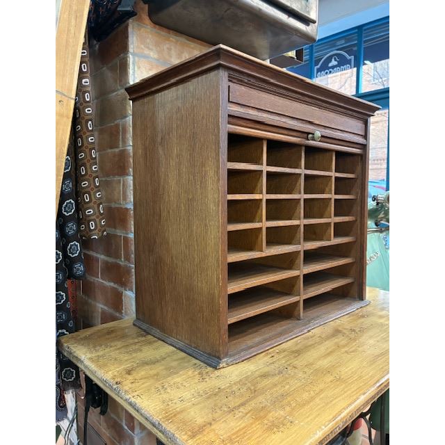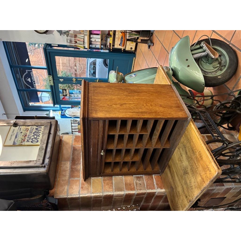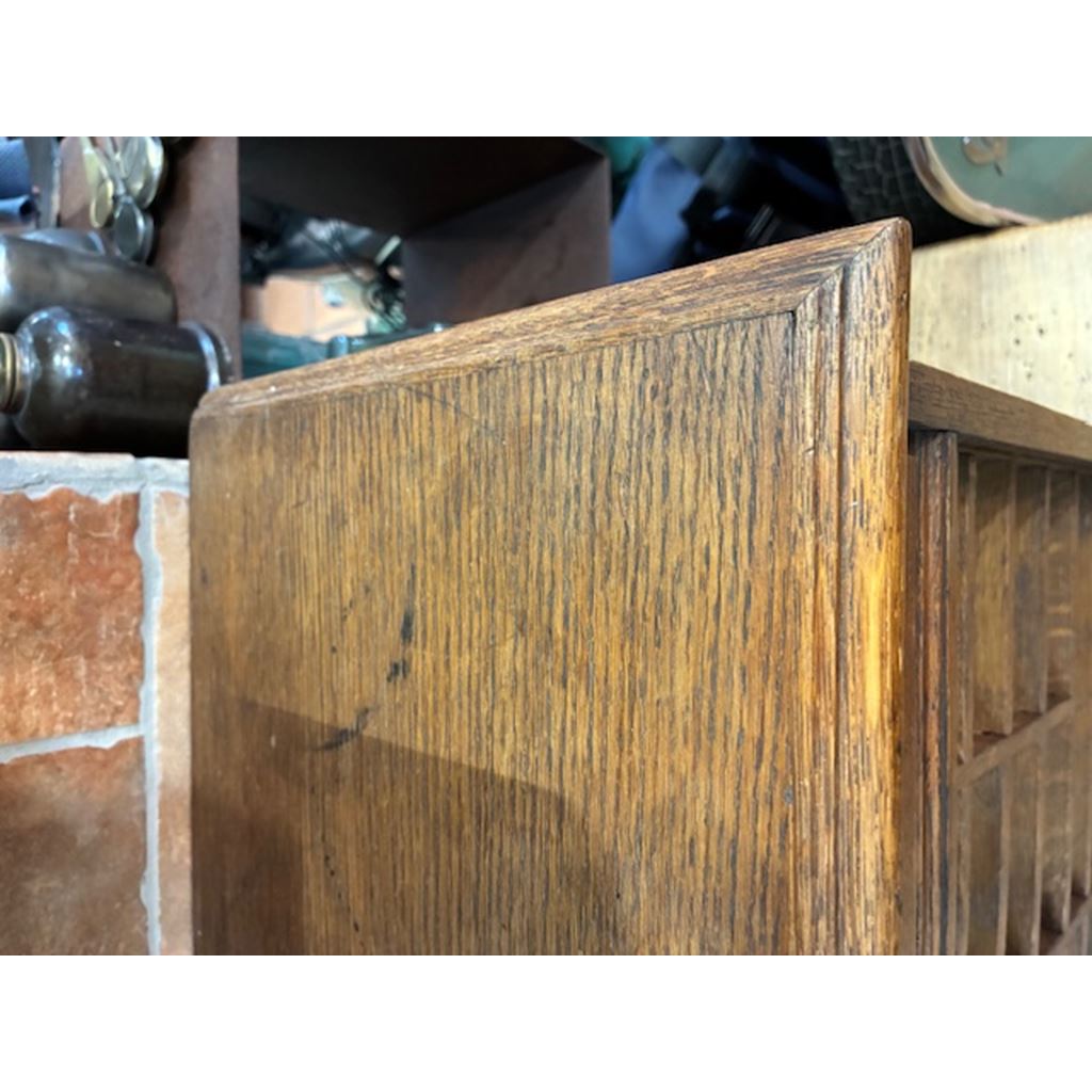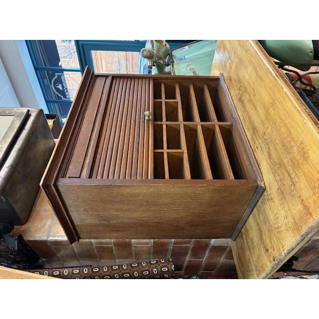 Ancien classeur en bois avec un système d'ouverture à volet qui fonctionne parfaitement. Son intérieur est soigneusement compartimenté en plusieurs sections, idéal pour organiser des documents, des lettres, des factures, des fournitures de bureau ou de petits objets.