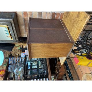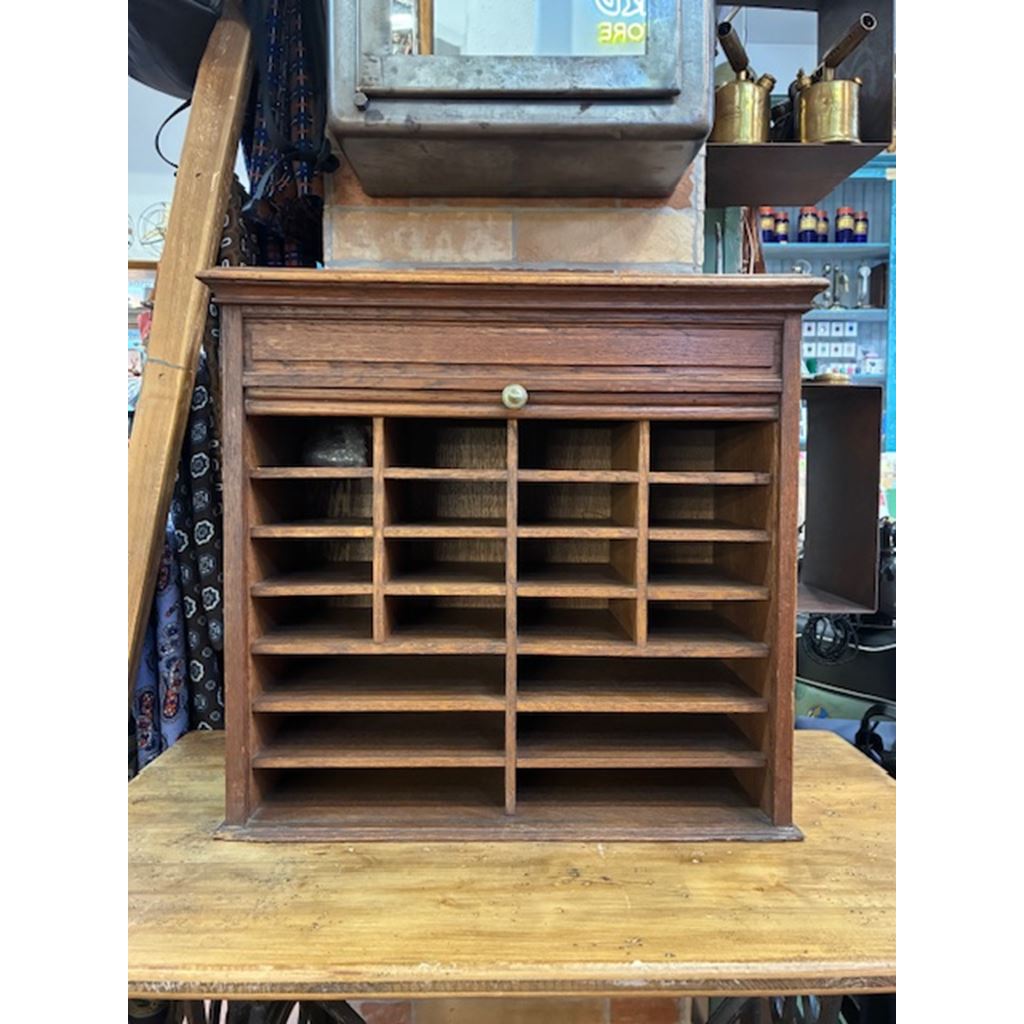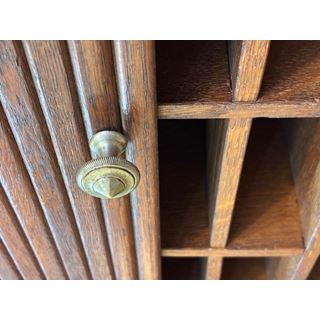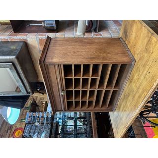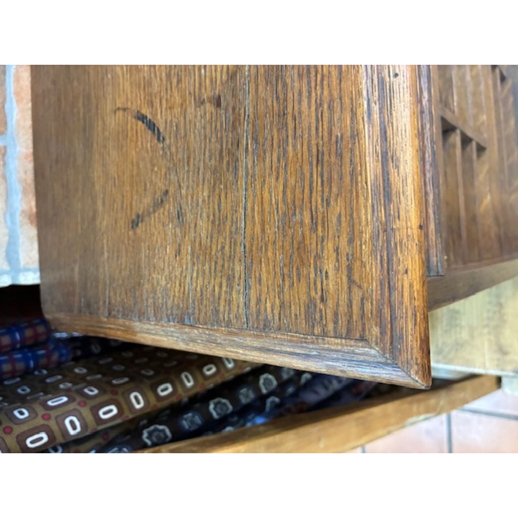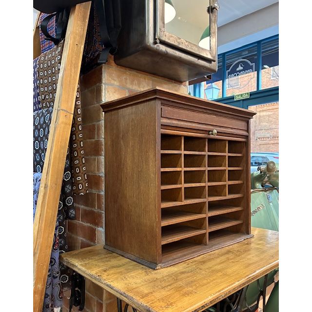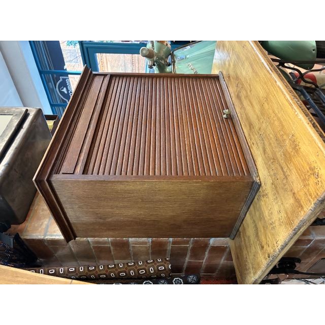 Ancien classeur en bois avec un système d'ouverture à volet qui fonctionne parfaitement. Son intérieur est soigneusement compartimenté en plusieurs sections, idéal pour organiser des documents, des lettres, des factures, des fournitures de bureau ou de petits objets.
