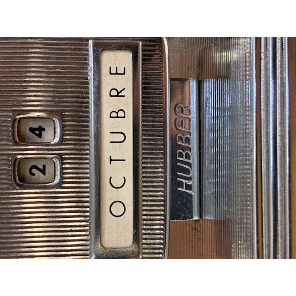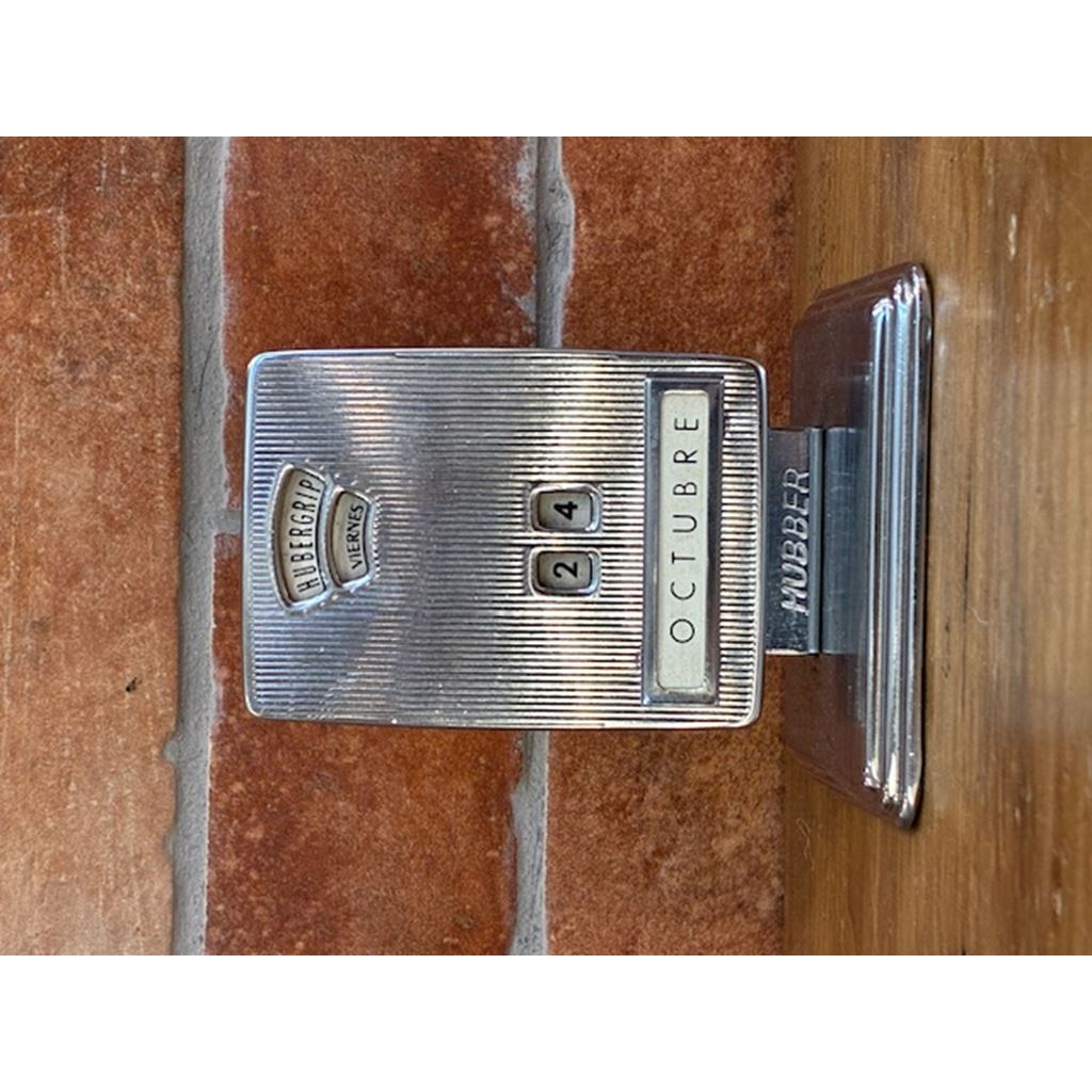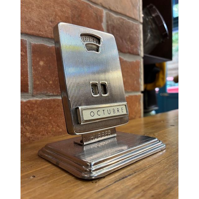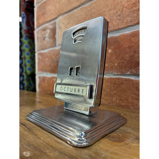 Scopri il fascino del passato con questo calendario da tavolo vintage Hubbergrip, un pezzo classico ideale per gli amanti dell'arredamento retrò e i collezionisti di oggetti storici. Realizzato in metallo cromato e progettato con eleganti linee verticali, questo calendario perpetuo consente di regolare manualmente il giorno, il mese e il giorno della settimana, combinando stile e funzionalità senza tempo.